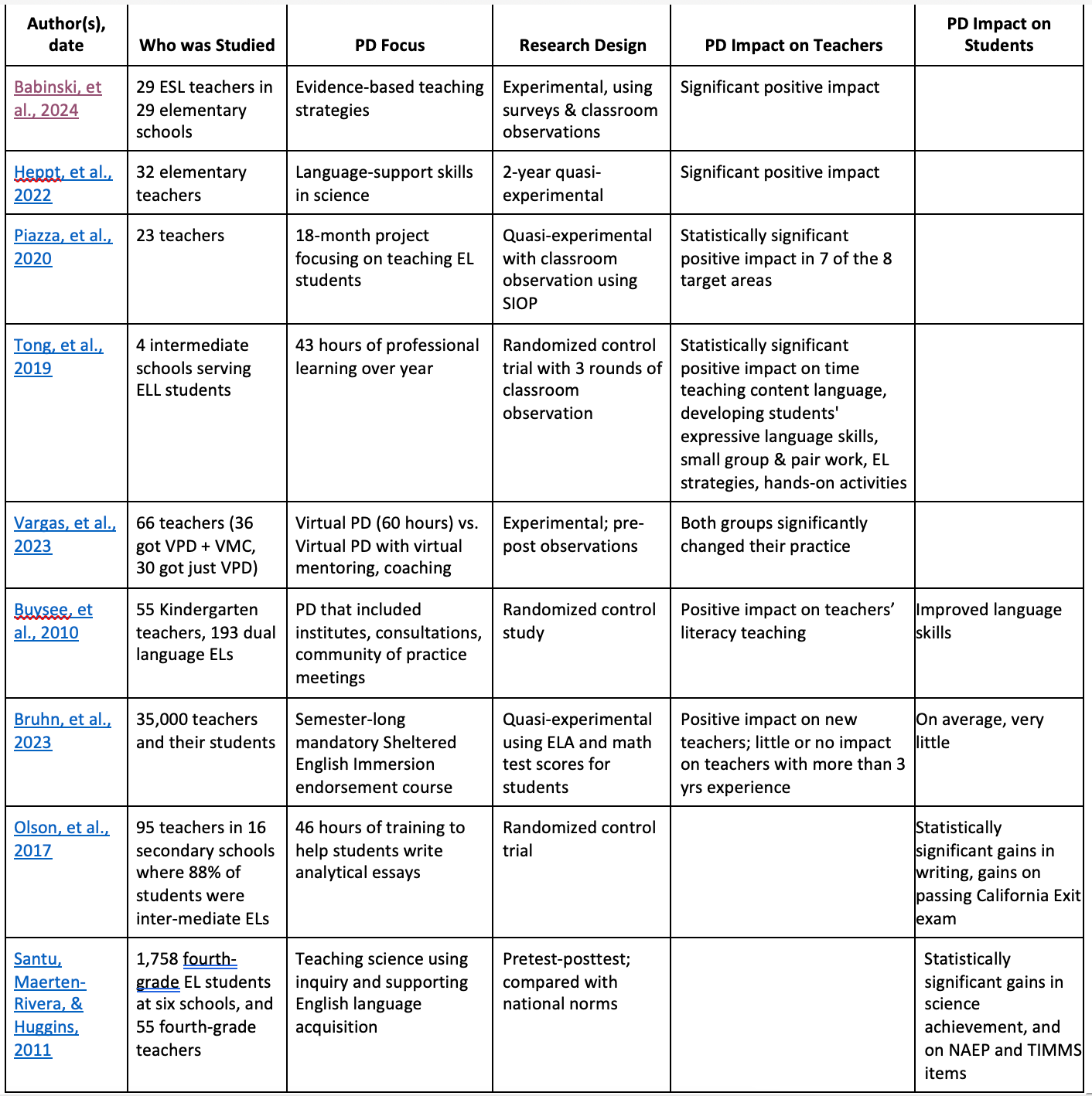 I identified nine published studies, summarized in the table below. All nine used an experimental or quasi-experimental research design to assess the impact of teacher professional development on teachers’ ability to teach EL students; four also examined the impact of teacher’s newly acquired practices on English learner students.